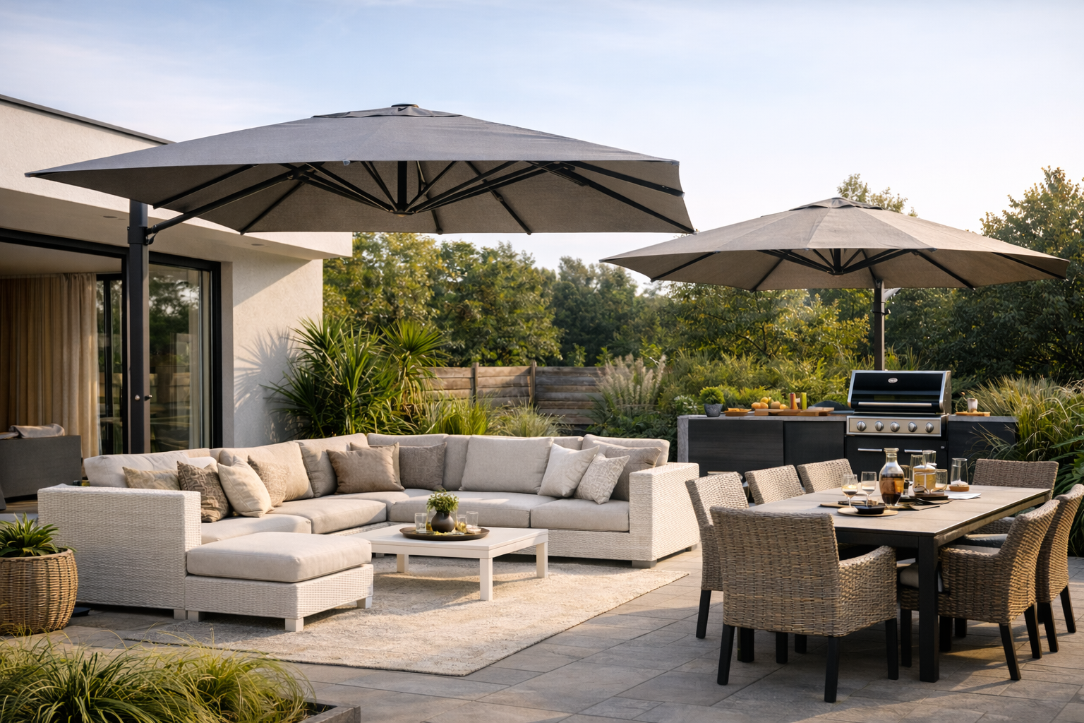 Parasole klasy premium projektowane są z myślą o intensywnym, codziennym użytkowaniu. Różnice widać już na etapie konstrukcji. Stabilne maszty, zaawansowane mechanizmy regulacji oraz solidne czasze sprawiają, że parasol przestaje być elementem sezonowym, a zaczyna pełnić rolę stałego zadaszenia tarasu. W zestawieniu z nowoczesnymi kompletami wypoczynkowymi, takimi jak nowoczesny zestaw mebli ogrodowych LOOP I, parasol premium tworzy spójną i funkcjonalną całość.